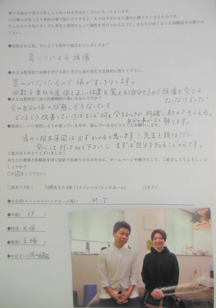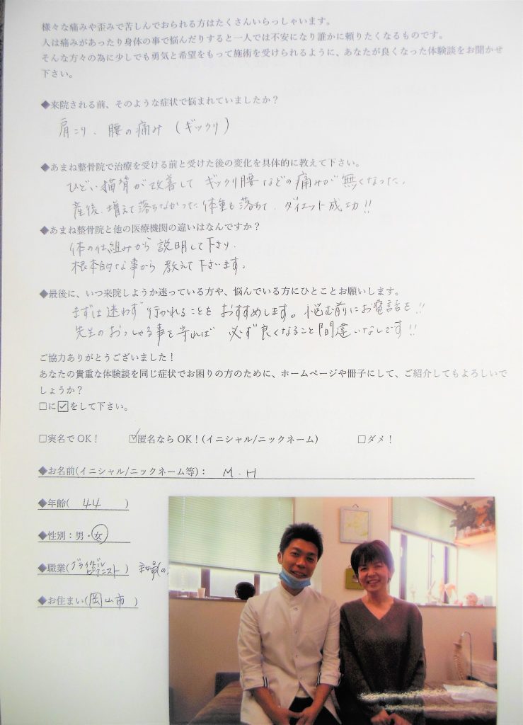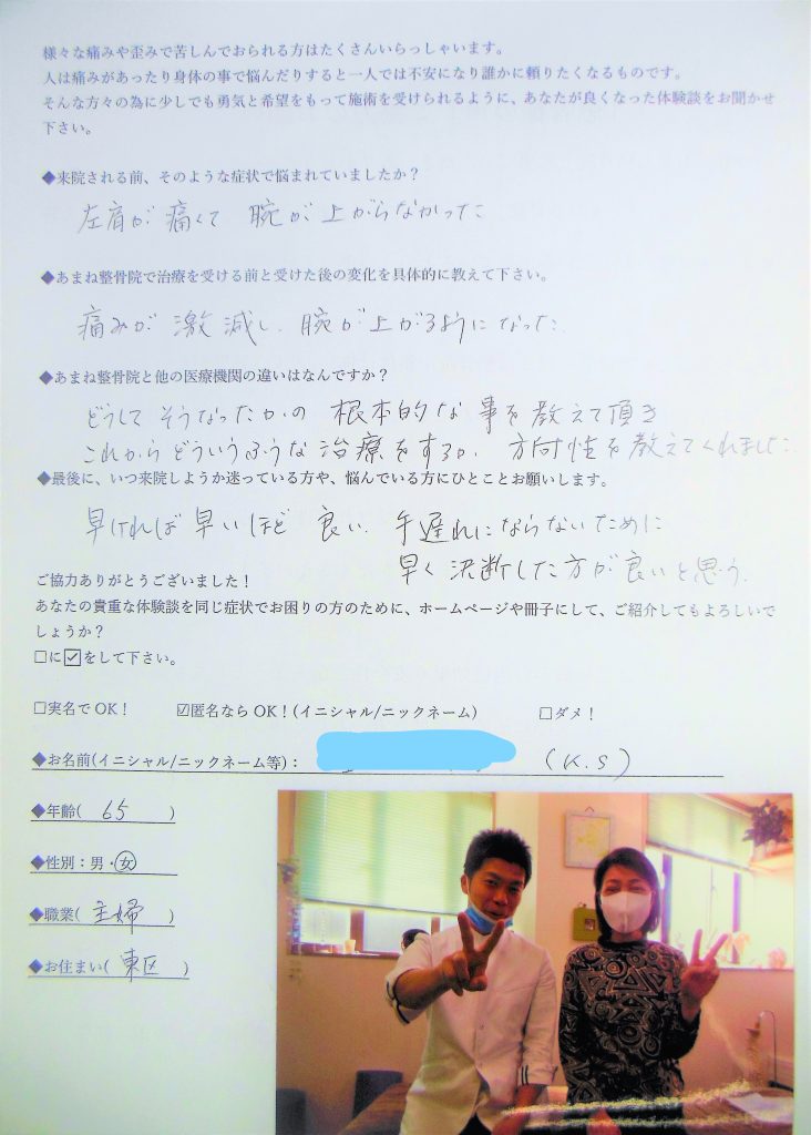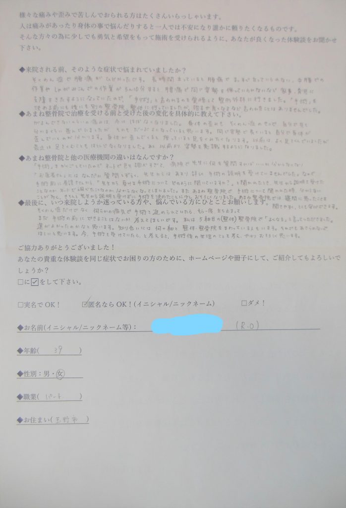 「手術」を覚悟していたのでネットを色々調べすぎて、病院で先生に何を質問すればいいか分からなくなり、「お医者さん」にはなんだか質問しずらく、先生からあまり詳しく手術の説明を受けていませんでした。なので手術前に看護師さんから「先生から受ける手術についてどのように聞いてますか?」と聞かれたとき、先生から説明を受けたことなのか、ネットで調べたことなのか、分からなくなってしまいました。またあまね整骨院で手術について聞かれた時、分からない事が多く、きちんと先生から説明を受けずに手術を決めた事に少しおそろしくなりました。あまね整骨院では疑問に思った事を聞きやすく、とても安心できます。