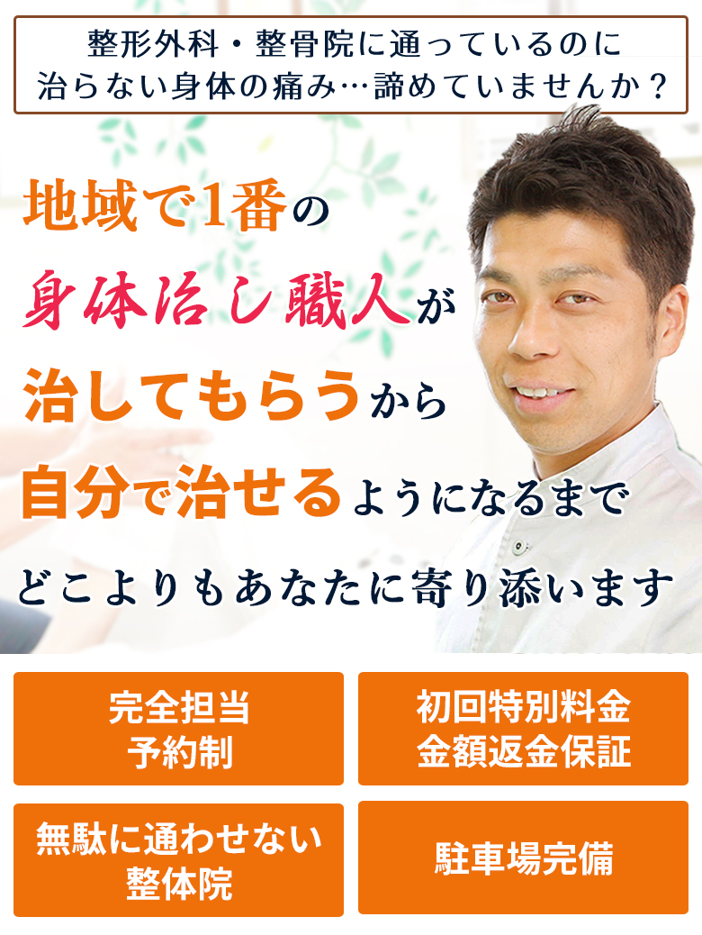 私はこれまでに、柔道整復師として大変多くのつらい身体の痛みで悩まれている患者様に携わってきました。その中で培った技術でどうしても「効果が感じられない・・・」と思った場合は、初回の施術が終わった時点でお伝えください。1mmも改善しなければ、その場で初回施術費を全額返金させていただきます。